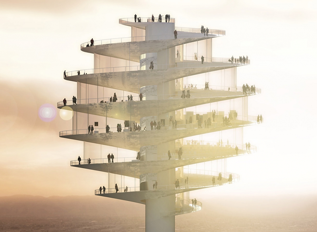 La torre de observación se concibe como un núcleo esbelto de hormigón armado con una esfera espiral al aire libre en su parte superior, parecido a un alfiler clavado firmemente que marca una ubicación en el mapa. La esfera espiral contiene espacios de recreación a los que se acceden a través de tres ascensores de vidrio que conectan la base con la cumbre y ofrecen vistas panorámicas de la ciudad. Además, los visitantes pueden caminar hacia abajo desde la parte superior a través de un paseo en espiral. Esta disposición combina los diferentes elementos programáticos y la circulación en un espacio dinámico, produciendo una experiencia única. En lugar de una anchura constante, el paseo en espiral comienza en cero en el punto de llegada, alcanza su máxima anchura en el medio, y se contrae de nuevo a cero en el punto de partida. El movimiento se asemeja a un viaje a través del centro de un planeta, un recorrido por el norte hasta el polo sur.