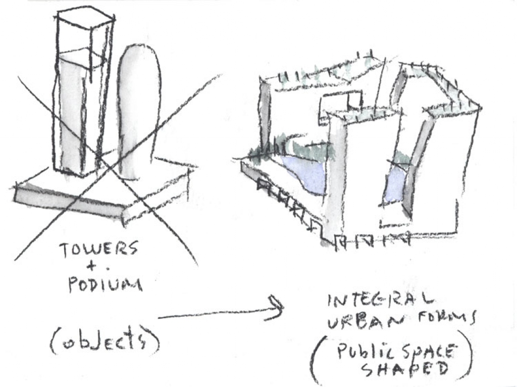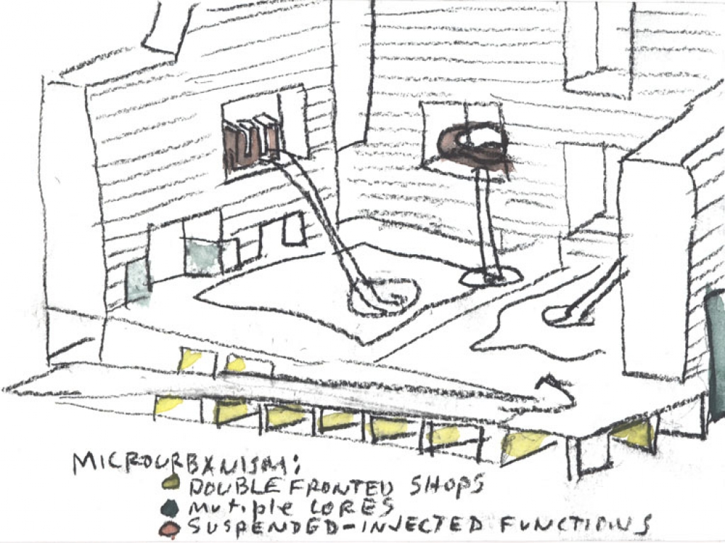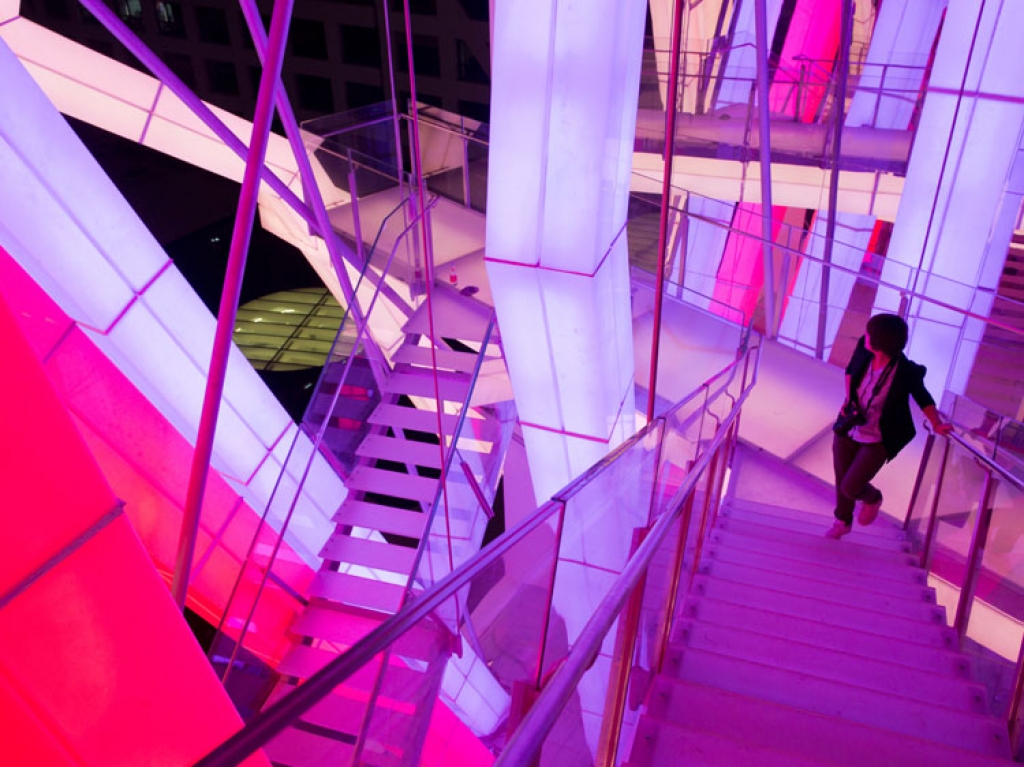 La estructura de hormigón blanco recibe una serie de cortes que modelan la geometría de las cinco torres y optimizan el aprovechamiento de la luz natural. Entre ellas, se sitúan tres pabellones diseñados por el mismo Holl, Han Meilin y el recientemente fallecido Lebbeus Woods.