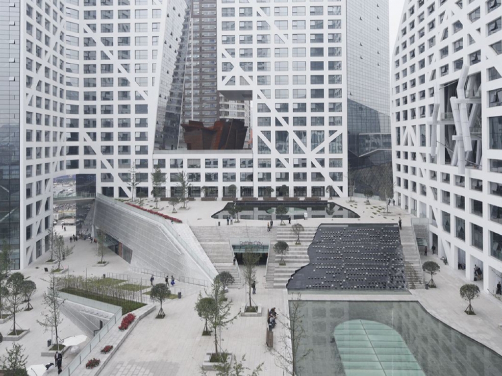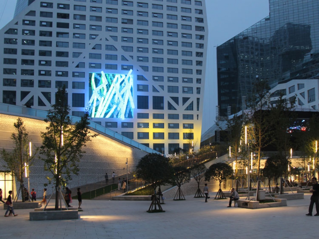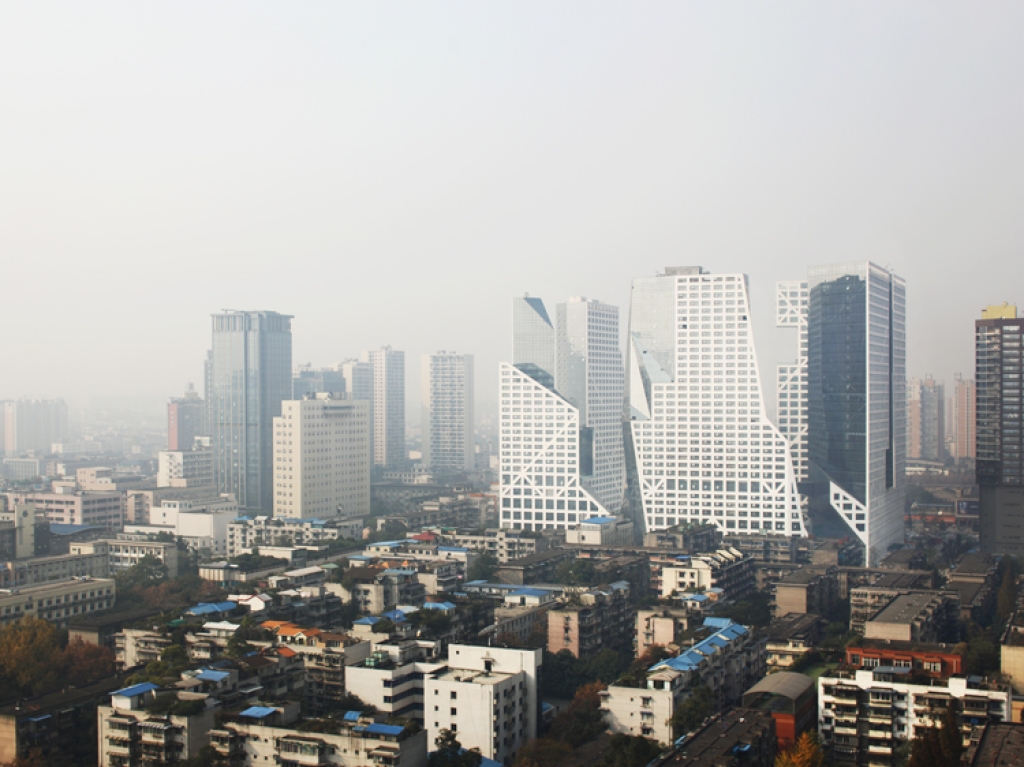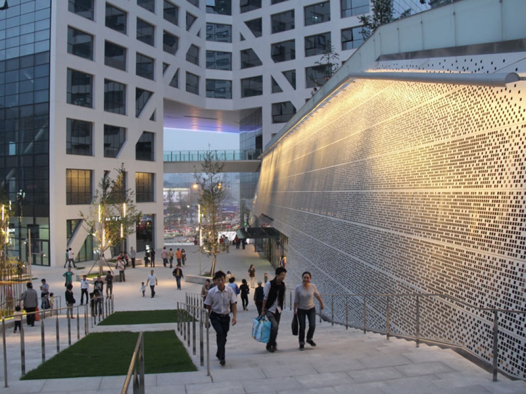 El gran complejo está inspirado en una composición literaria del poeta local Du Fu (713-770), quien escribió : 'From the northeast storm-tossed to the southwest, time has left stranded in Three Valleys. Una gran plaza pública queda construida en tres niveles, en cada uno de los cuales se ubica una fuente que hace referencia a diferentes conceptos de tiempo: el calendario anual chino, los doce meses y los treinta días.