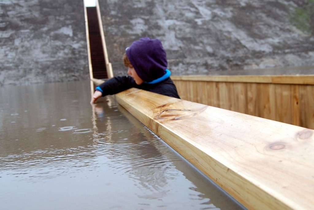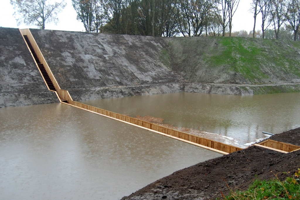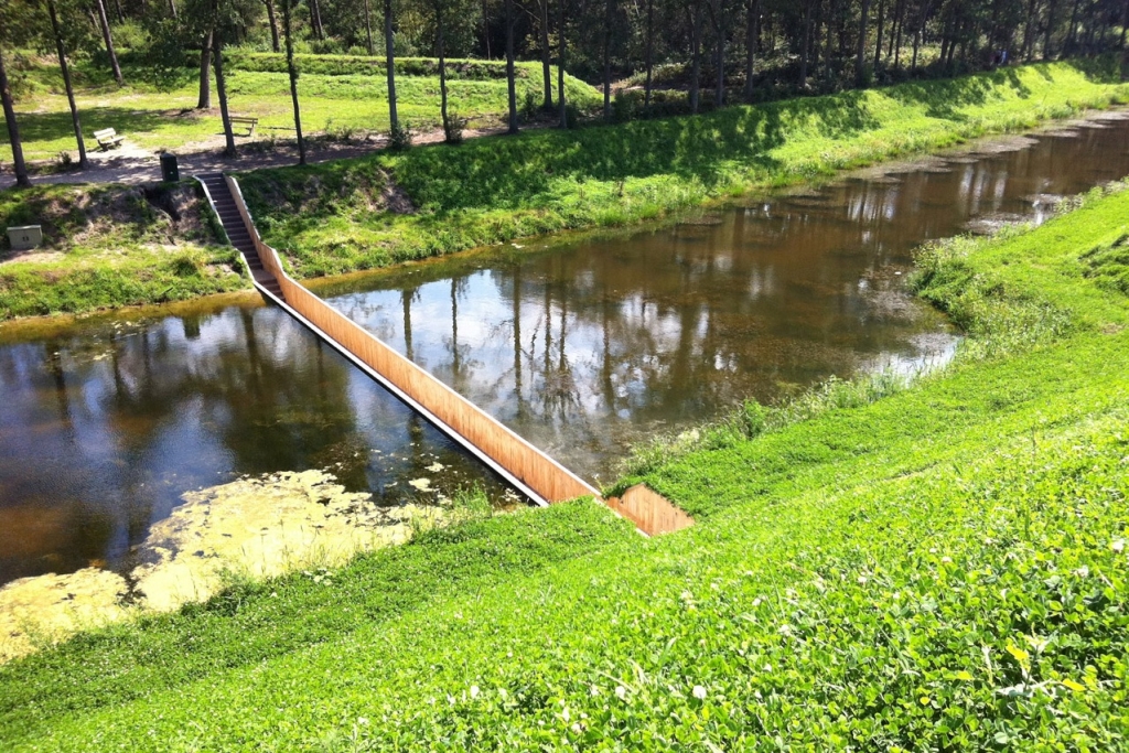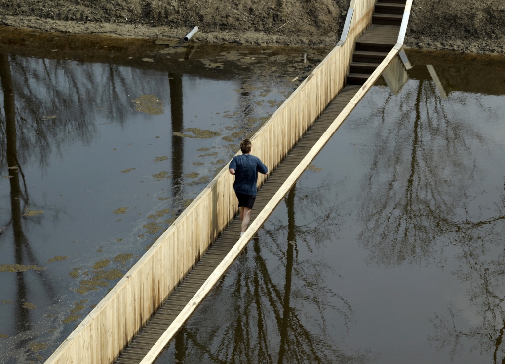 Por ello, a raíz de la restauración de este límite defensivo, es cuando este estudio interviene con el diseño de este puente que queda ubicado en uno de sus fosos, Fort de Roovere. Llama la atención, como a diferencia de las pasarelas convencionales que se elevan por encima del cauce, Moses Bridge se ha instalado como una línea divisoria que abre el canal dejando al peatón casi a ras del agua (910 cm bajo el nivel de la superficie). Su composición se ha realizado utilizando Accoya (madera artificial patentada y creada a partir de coníferas) y angelim vermelho (árbol tropical situado en la Amazonia brasileña), además se ha recubierto con una capa de EPDM, que permite protegerlo de los agentes atmosféricos y sus particulares condiciones ambientales.